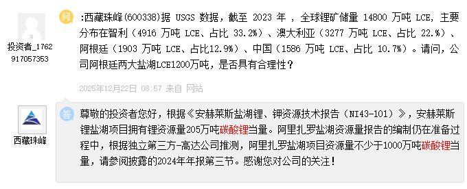 西藏珠峰称,公司安赫莱斯锂盐湖项目拥有锂资源量205万吨碳酸锂当量,阿里扎罗盐湖资源量报告的编制仍在准备过程中,根据独立第三方公司推测,阿里扎罗盐湖项目资源量不少于1000万吨碳酸锂当量。
