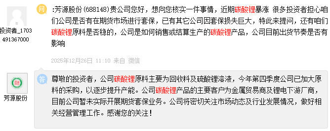 芳源股份介绍,公司碳酸锂原料主要为回收料及硫酸锂溶液,2025年第四季度公司已加大原料的采购,以逐步提升产能。