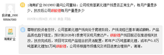 海南矿业表示,公司氢氧化锂产线尚处于爬坡阶段,产线流程已基本调试顺畅,产品品质也趋于稳定,预计到2026年1季度可实现月度达产。碳酸锂产线目前还在推进相关技改,技改完成后,项目可实现产品组合的灵活配置:即年产2万吨氢氧化锂,或年产0.8万吨氢氧化锂加1万吨碳酸锂。